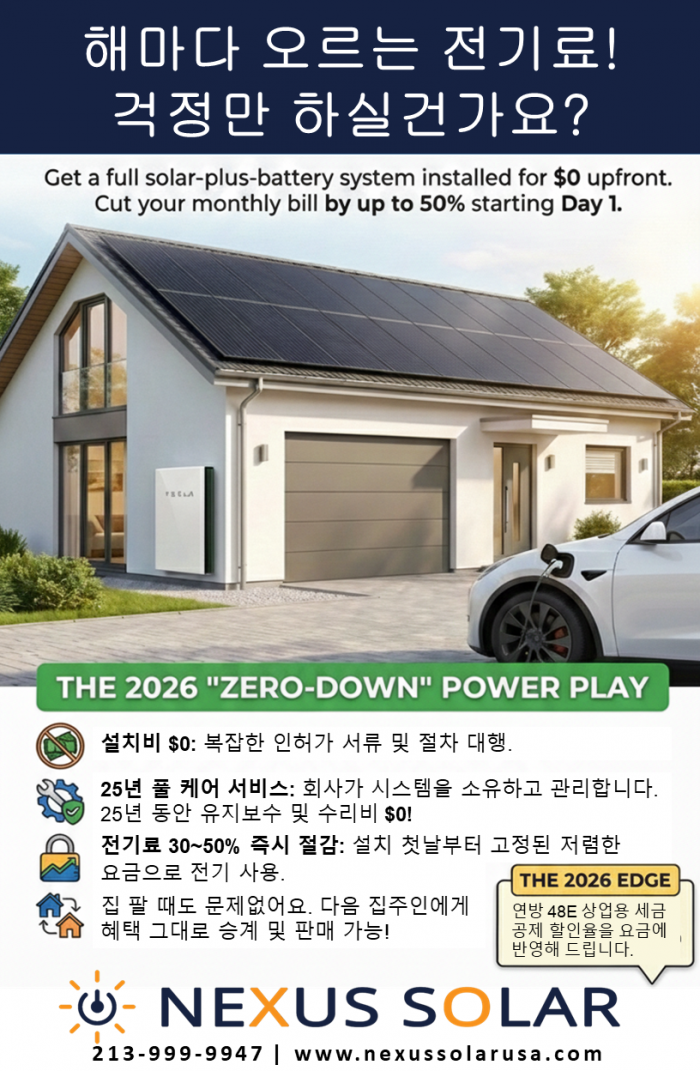 NEXUS SOLAR의 2026 "Zero-Down"파워플랜 – 초기비용 $0로 시작하는 스마트한 선택.