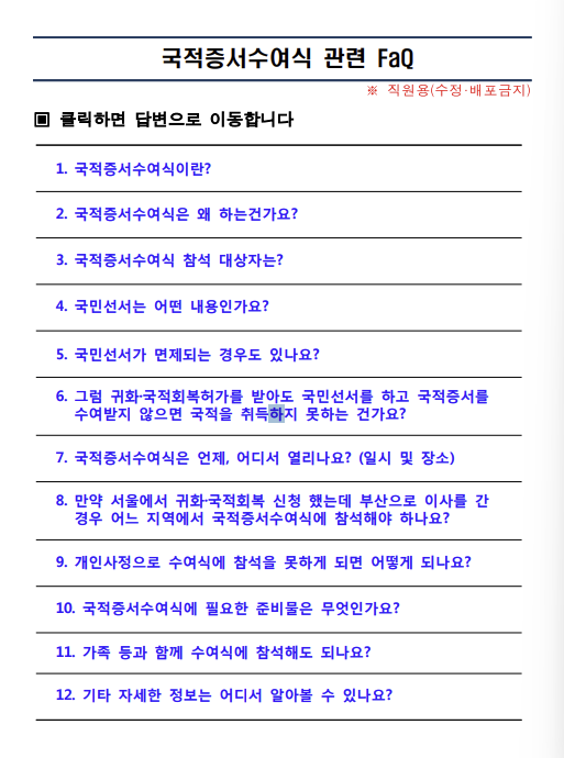 단순한 행사 개념이 아닙니다. 국적법 체계상 국적 취득의 최종 단계로, 이 절차를 통해 국적 취득이 확정됩니다. 따라서 수여식 일정과 시간을 정확히 확인하고 반드시 참석하는 것이 원칙입니다.