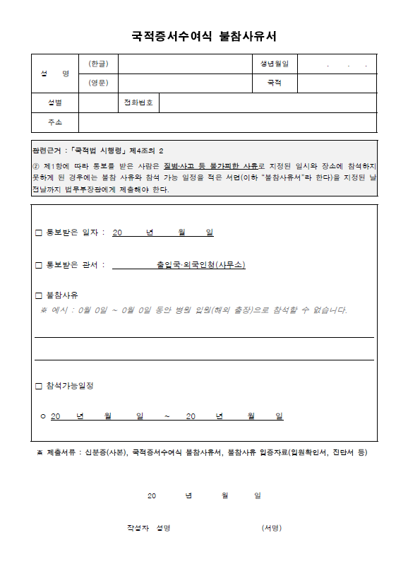국적증서 수여식 불참사유서 제출서류 및 절차 총정리_Absence Statement, Documents, Schedule, Time and Procedure