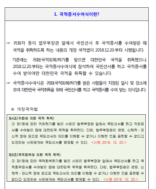 2. 수여식 당일 서약 제출 시 약 2~3주 후 주민등록 신청이 가능하며, 한국 여권 발급까지 약 1개월 이상 소요됩니다.