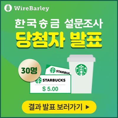 당첨자발표 한국송금 설문조사 이벤트 2020.02.07 - 한국 송금 설문조사에참여해주신 모든분들께 감사드립니다감사의 마음을 담아 30분께적지만 소정의 경품을 드립니다앞으로 다양한 이벤트가 열릴 예정이오니많은 참여 부탁드립니다당첨되신 분들께는 당첨이메일을 드리오니2월 14일까지 회…