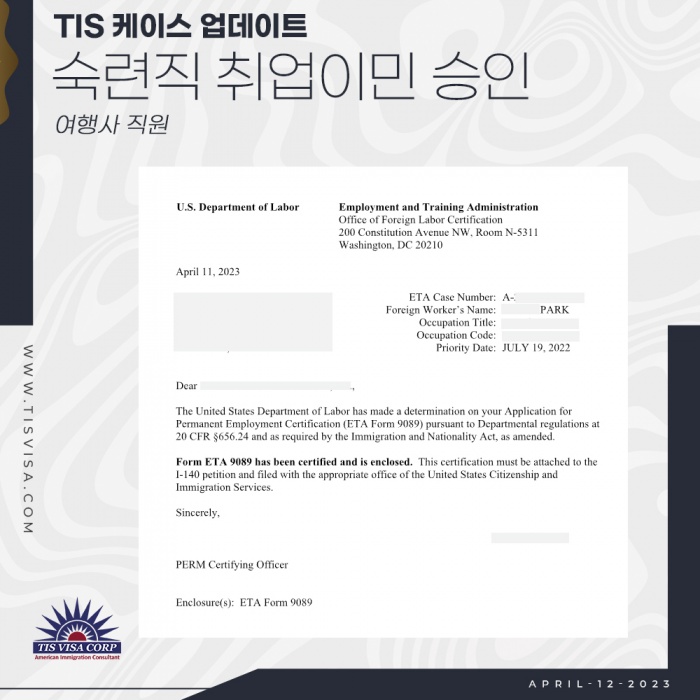 3순위 미국 숙련직 취업 이민 승인 2023.04.14
