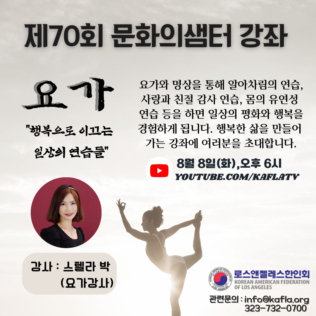 282. 70회 LA 한인회 문화의 샘터 행복으로 이끄는 일상의 … 2023.08.11 - 70회 LA 한인회 문화의 샘터 quotquot 행복으로 이끄는 일상의 연습들 (요가).rdquo요가와 명상을 통해알아차림의 연습사랑과친절감사연습몸의유연성연습등을 하면 평화와행복을경험하게됩니다.함께행복한삶을만들어가는 강좌에…