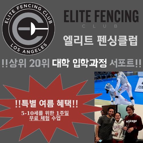 엘리트 펜싱클럽 // 대학 입학과정 서포트 // 특별 여름 혜택 1주일… 2024.05.31 - 상위 20위 대학 입학과정 서포트 - 전국 최고의 펜싱 클럽 중 하나 - 지역 대회 전국 대회 국제 대회 및 올림픽주니어 세계 선수권 대회를 위한 준비 - 대학 입학 절차에 대한 광범위한 지원 - 우리 졸업생들은Yale P…
