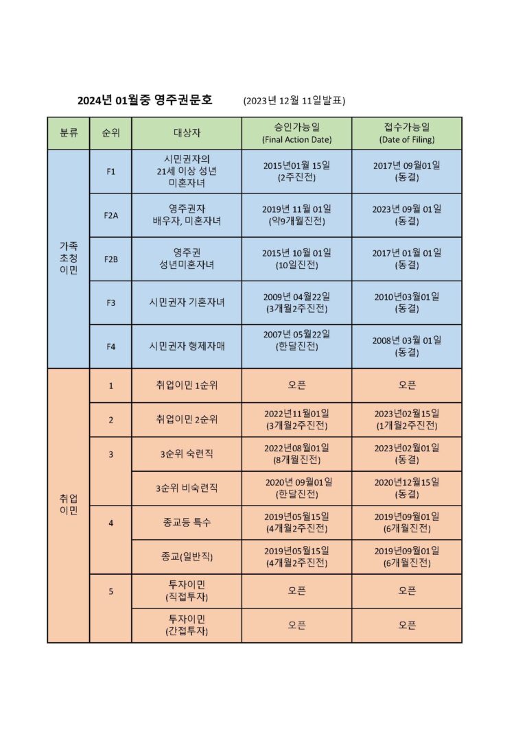 2024년 2월중 영주권문호 2024.01.12 - 2024년 2월중 영주권문호국무부(DOS)는 2024년 2월 영주권 문호(Visa Bulletin)를 발표했습니다.국무부가 1월 12일 발표한 2024년 2월의 영주권 문호에 따르면 취업이민 1순위 승인가능일(Final A…
