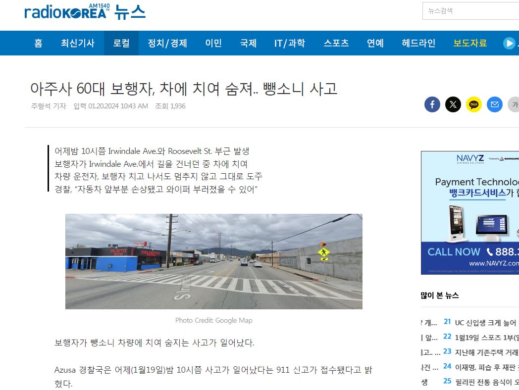 60대 보행자 차에 치여 숨져.. 뺑소니 사고 2024.01.22 - 보행자가 뺑소니 차량에 치여 숨지는 사고가 일어났다.Azusa 경찰국은 1월 19일 밤 10시쯤 사고가 일어났다는 911 신고가 접수됐다고 밝혔다.Azusa 경찰국 소속 경찰관들은 신고를 받고나서 즉각 사고 현장으로 출동한…